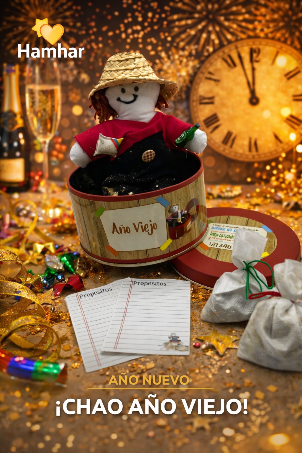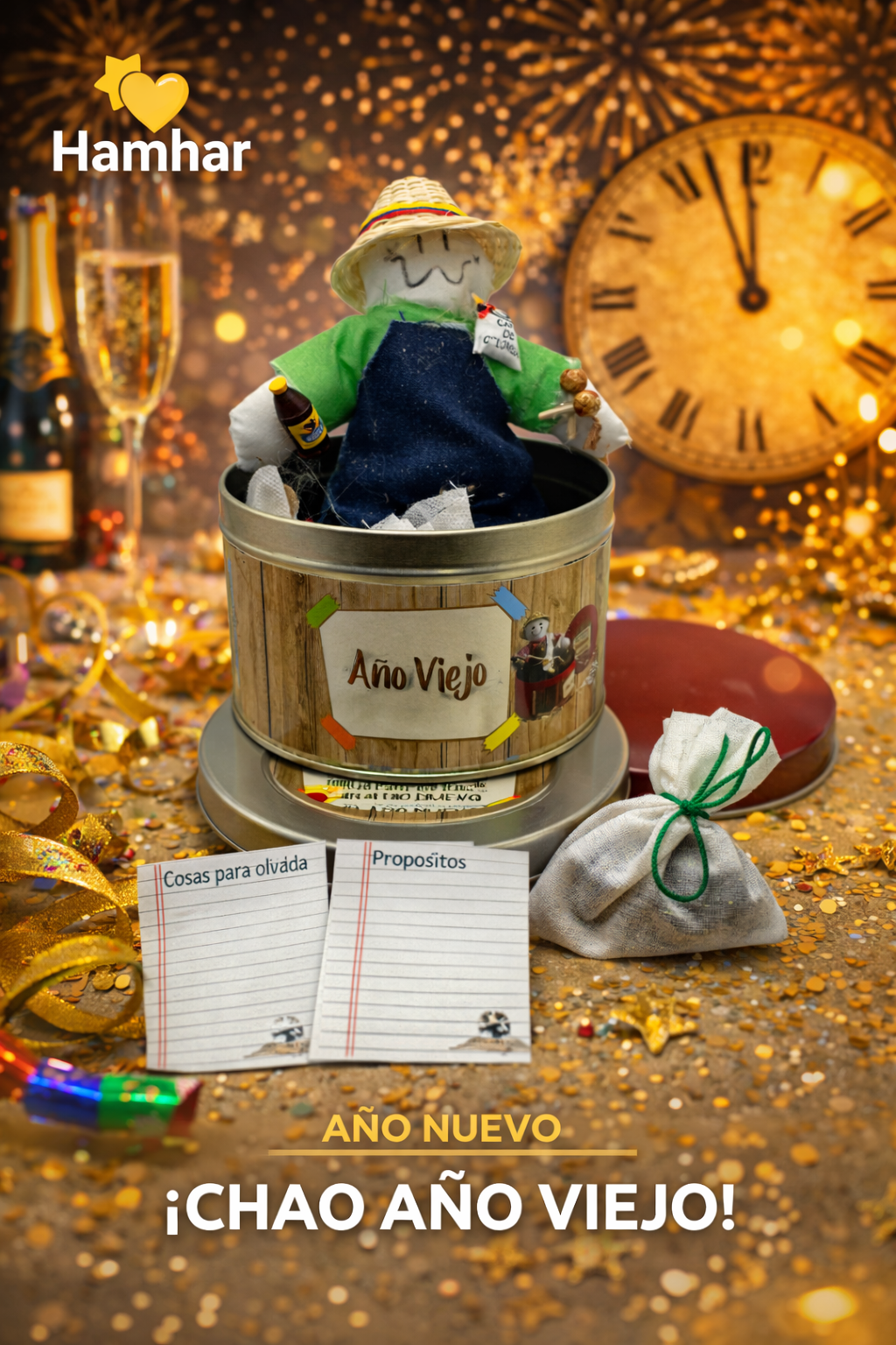 Caja metálica dorada o roja, alto 7 cm x ancho 13 cm con un año viejo 21 cm de alto, 2 tarjetas propósitos y 2 tarjetas de cosas por olvidar, 1 bolsita de lentejas y 1 bolsita de clavos