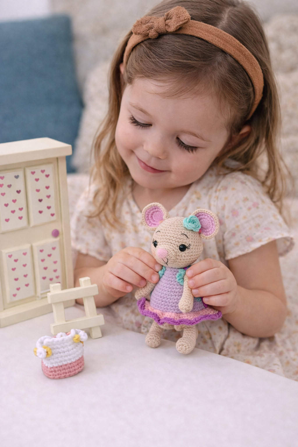Ratona Pérez tejida a mano en crochet. Los materiales que utiliza son lana, hilos y botones. El Kit incluye escalera y una puerta.